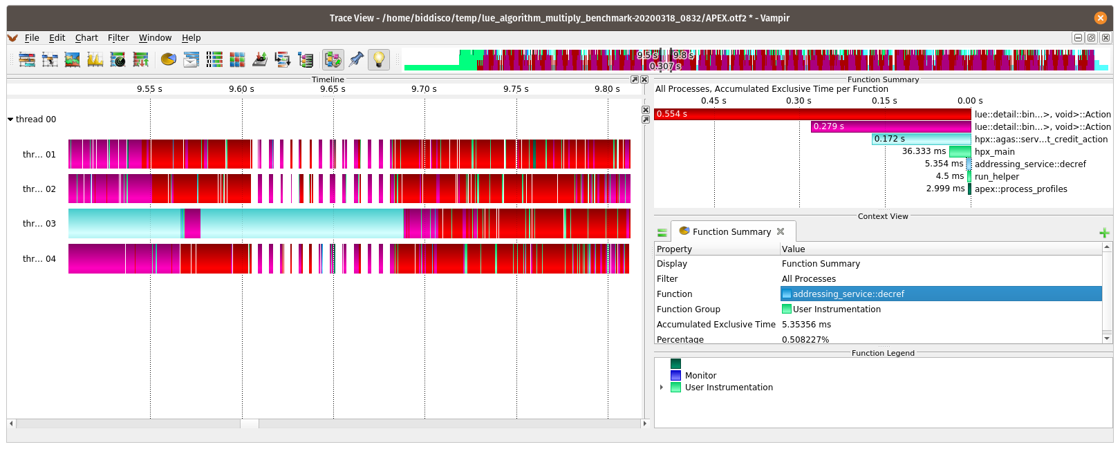 Hi all. I have a simple benchmark that multiplies and divides partitioned arrays for a number of iterations (single node, 4 cores). When I look at a plot of the thread idle rates I see low values (<10%) with spikes (40, 60, even 100%) at regular intervals. A trace loaded in Vampir suggests the spikes in idle-rate correspond with calls to `hpx::agas::server::primary_namespace::decrement_credit_action`. At those moments, the